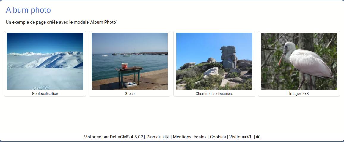 Le module Photo affiche vos images sur une seule page, en effet nombre d’utilisateur n’ont pas plusieurs galeries à afficher sur leur site, le module Album est alors sur-dimensionné.