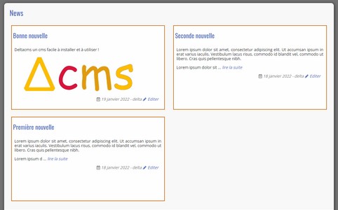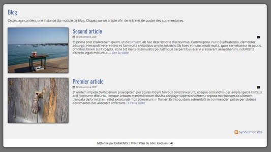 Fonctionnalités : des articles avec image d'en-tête, droit d'édition par groupe, approbation des commentaires , volume des commentaires en caractères, notification par email du dépôt d'un commentaire, flux RSS.