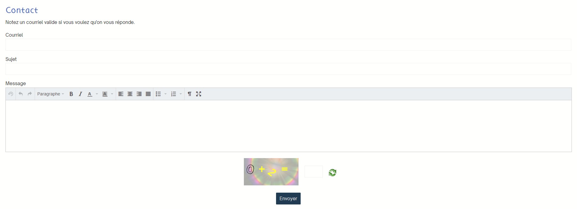 Fonctionnalités : champ texte, champ courriel facultatif et masqué, zone d'édition pour le commentaire.
