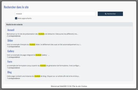 Le module de recherche permet de réaliser des recherches de termes dans toutes les pages d'un site. Le thème est paramétrable, les libellés de la zone de recherche sont modifiables.